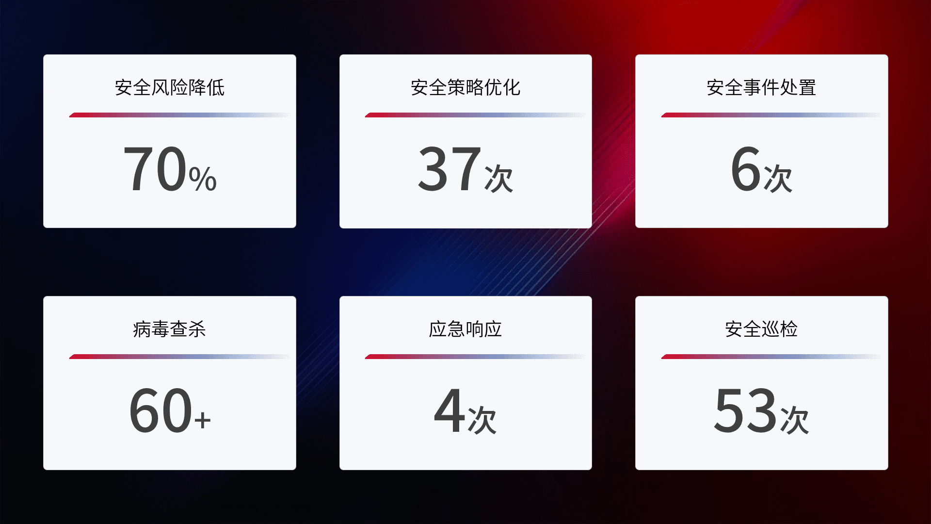 提供全面的安全事件报告体系,,,,包括处置报告、、周报、、季度和年度总结,,,结合持续监控,,帮助客户深入了解网络安全状况。。。