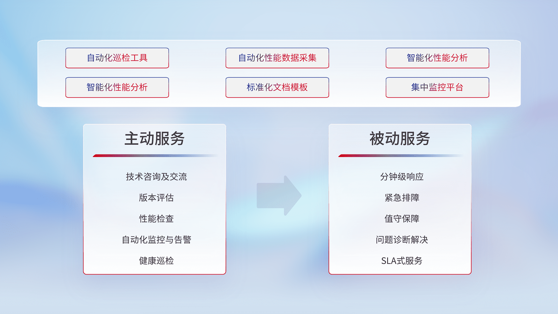 智能化工具和标准化文档,,保障服务质量,,提供主动服务(包含技术咨询、、、、版本评估、、、性能检查、、、自动化监控与告警、、、、健康巡检)和被动服务包含(分钟级响应、、、紧急排障、、、、值守保障、、、、问题诊断解决、、SLA服务)。。。。